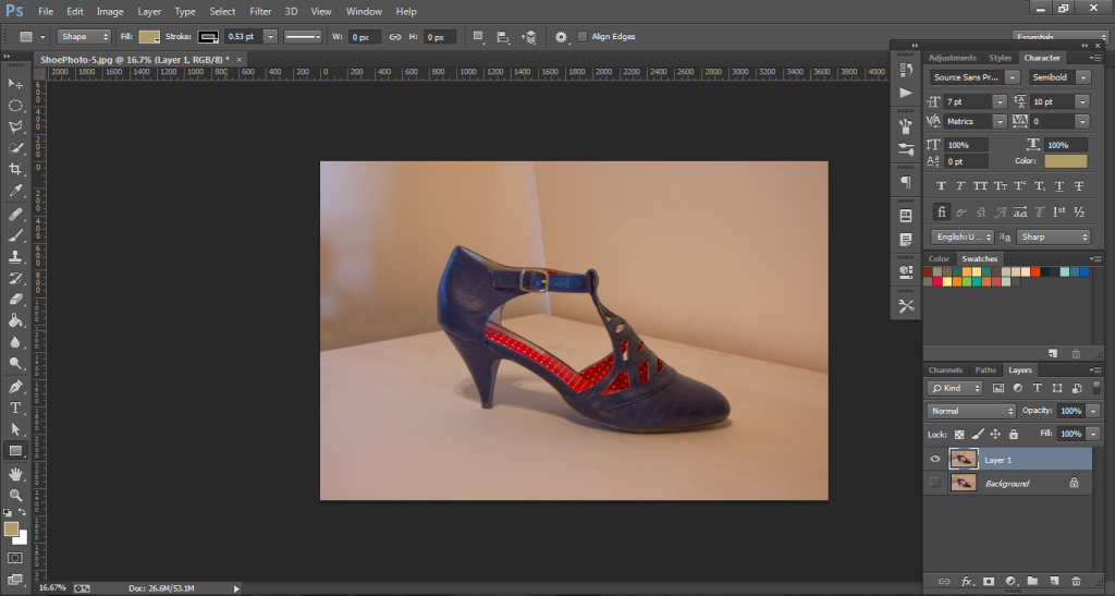 Use a round brush, about 80% opacity and 50-60% hardness, and select a nice, dark grey color. You may want to select your color directly from the shadow on the original, unedited shoe photo. Lightly paint in a shadow underneath the shoe so it doesn’t look like it’s floating in mid-air.